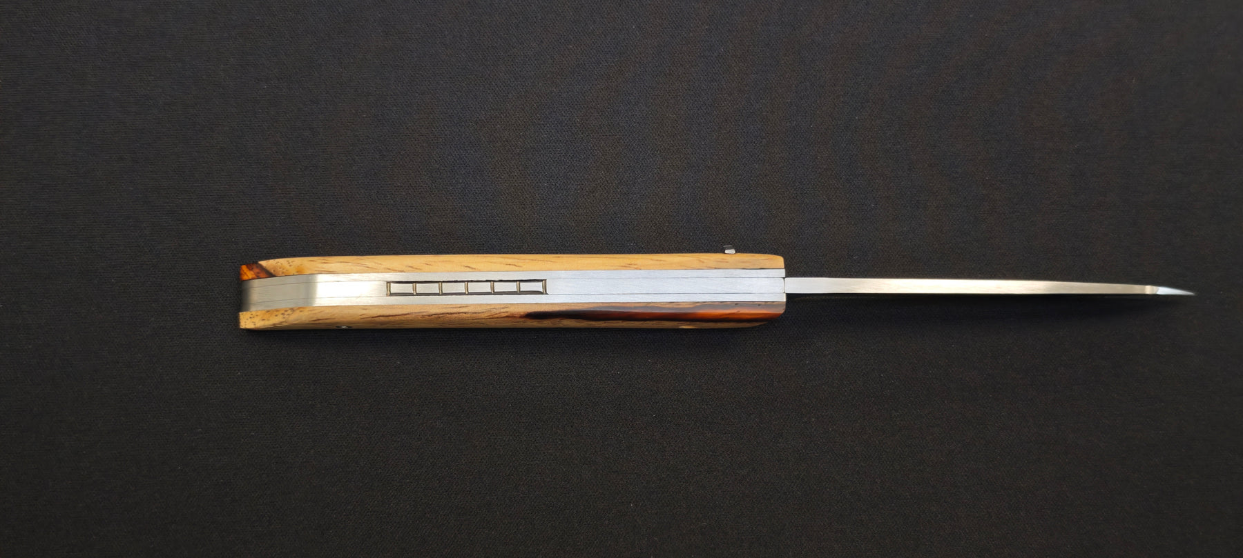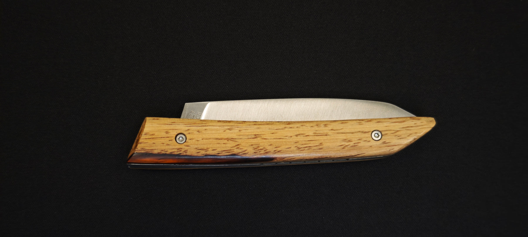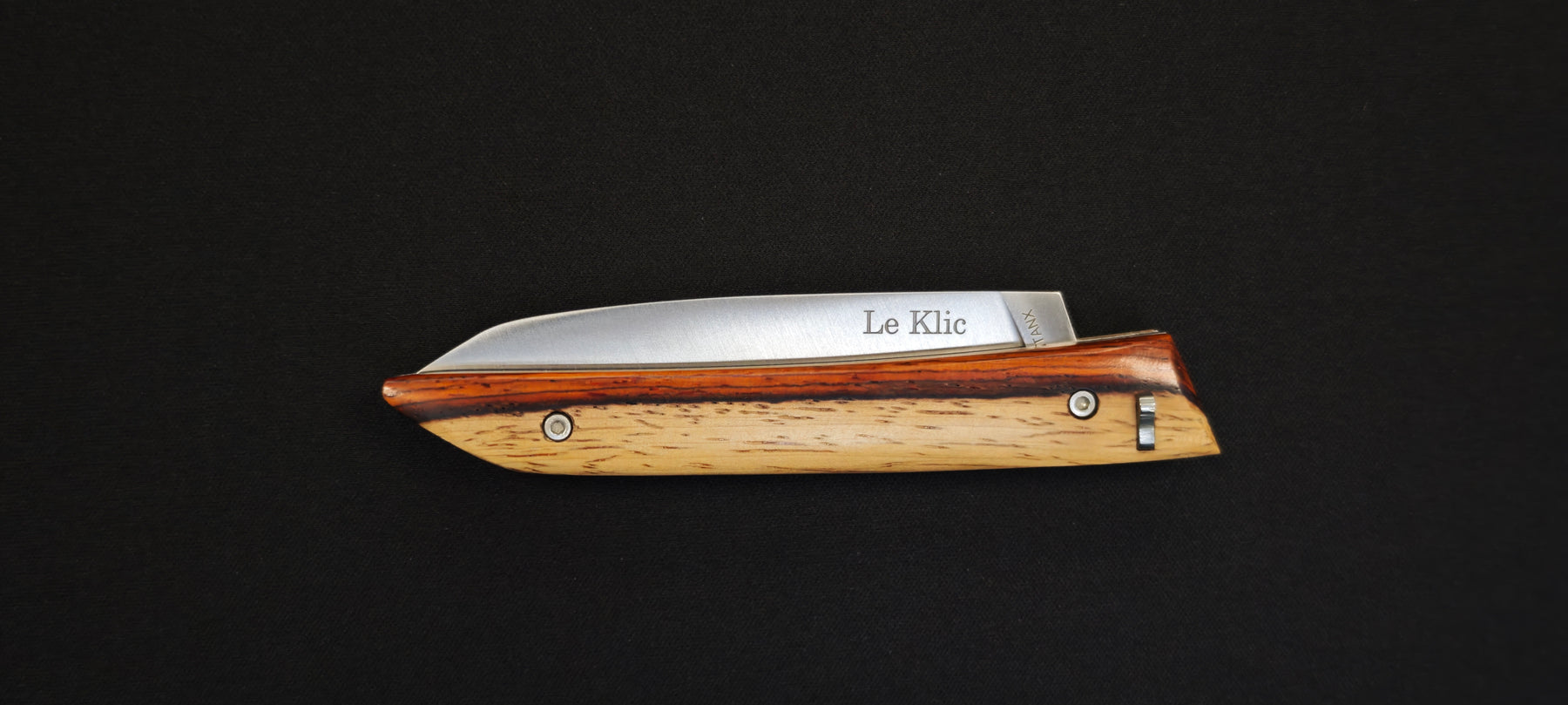 Le couteau pliant Le Klic, conçu par JP Hontanx, associe un savoir-faire artisanal à des matériaux soigneusement sélectionnés. Son manche est réalisé en cocobolo et aubier, offrant un contraste naturel unique et une prise en main agréable. Chaque pièce présente des nuances propres au bois, rendant chaque couteau légèrement différent.