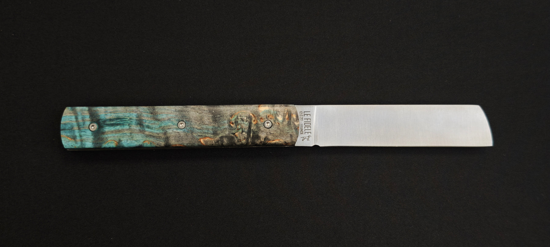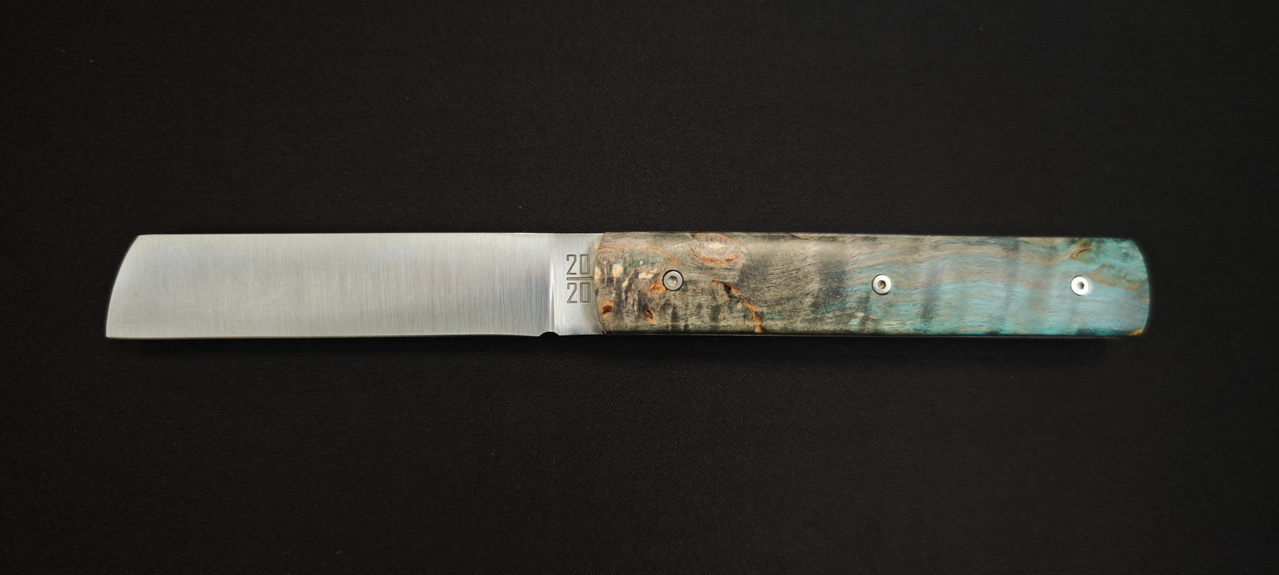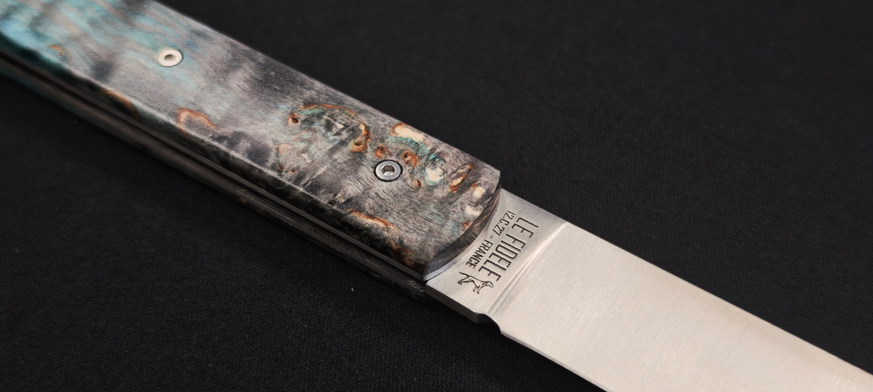 Jouant avec des manches autant rustiques et naturels que des manches sophistiqués et teintés. Du mammouth à l'olivier en passant par l'abalone, l'or et le pistachier, ce couteau possède un magnifique panachage de possibilité. L'air de la modernité artisanale du coutelier est naît.