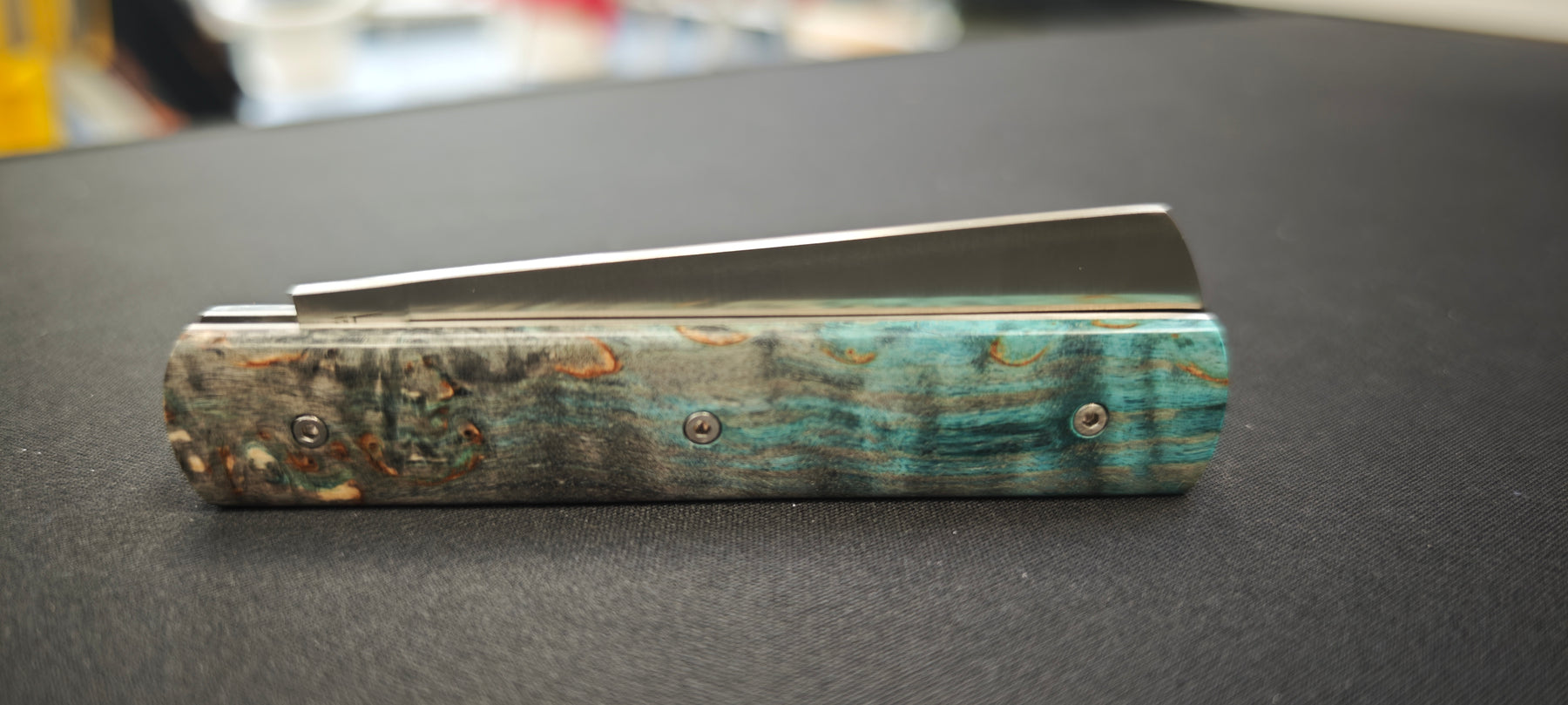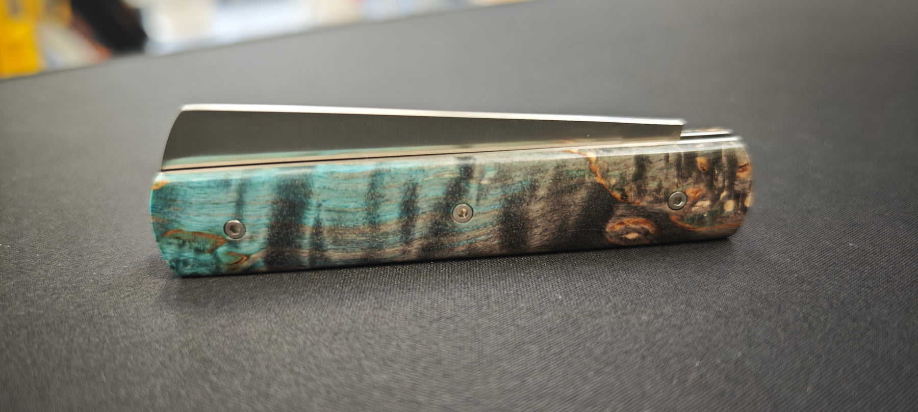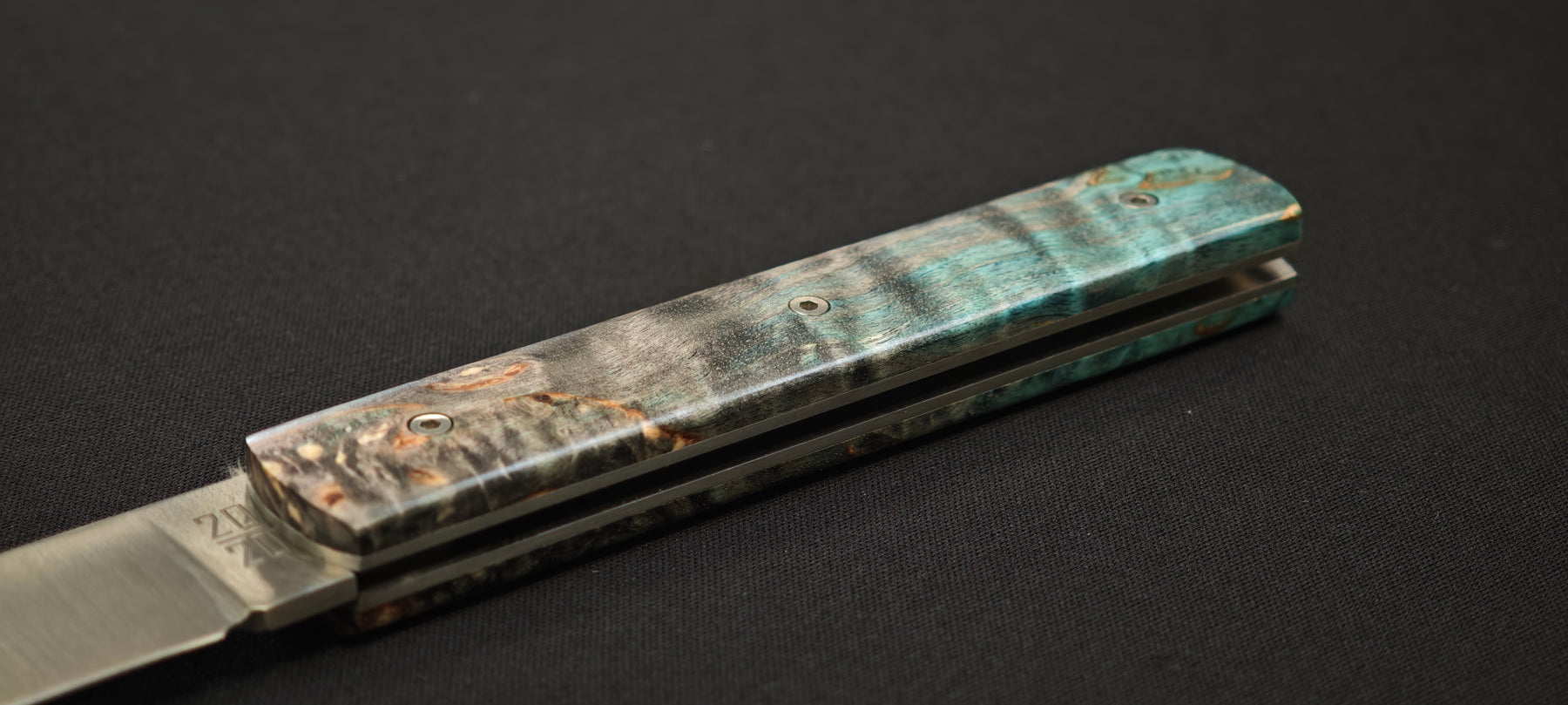 Jouant avec des manches autant rustiques et naturels que des manches sophistiqués et teintés. Du mammouth à l'olivier en passant par l'abalone, l'or et le pistachier, ce couteau possède un magnifique panachage de possibilité. L'air de la modernité artisanale du coutelier est naît.
