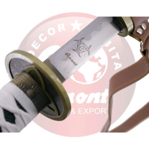 Katana von Michonne aus The Walking Dead, inoffizielle Nachbildung einer 103 cm langen Stahlklinge, braune Curpiel-Scheide mit weißer Kordel und Band zum Aufhängen an der Rückseite, Griff mit weißer Kordel.
