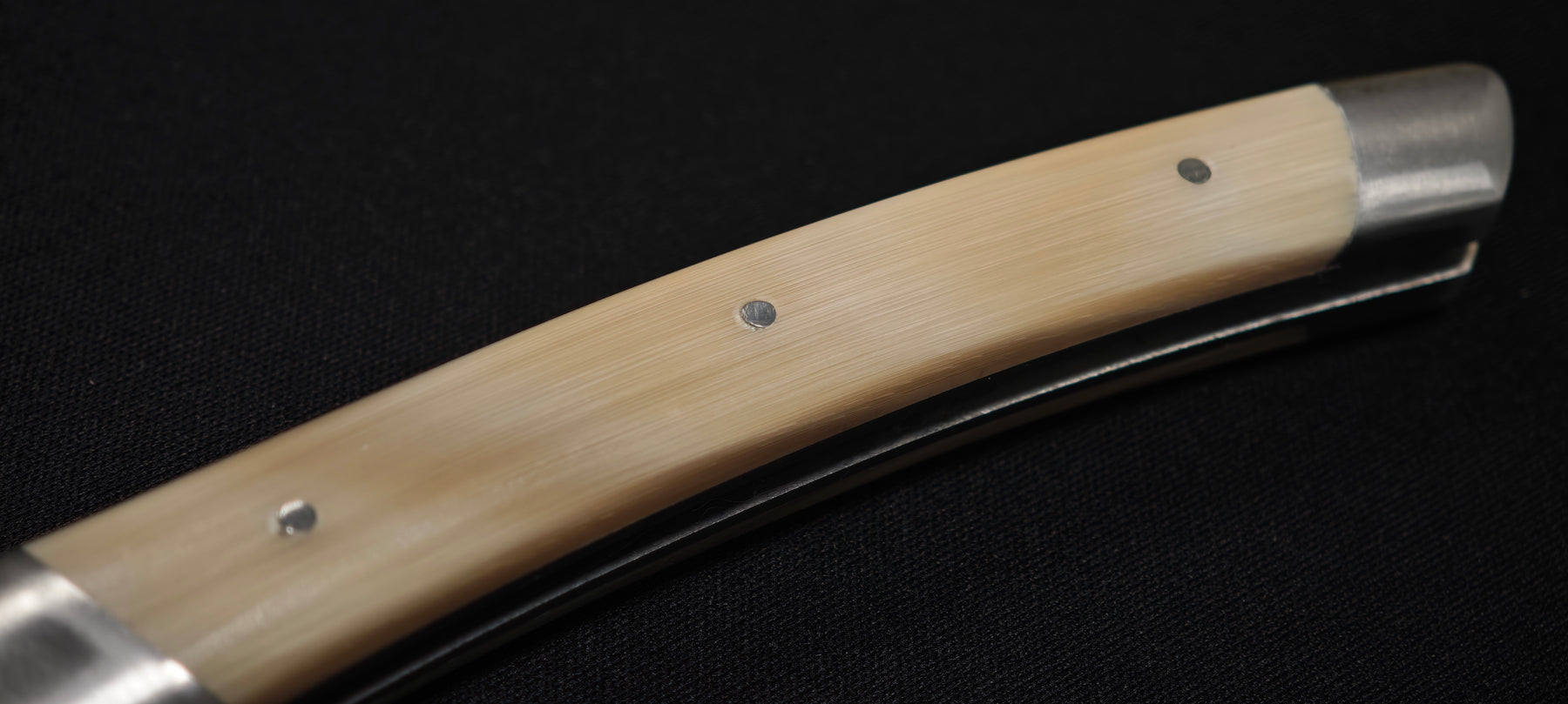 Le manche est réalisé en corne blonde naturelle, un matériau résistant et noble, qui confère au couteau une esthétique classique et élégante. Les deux mitres en inox et les parties métalliques brossées apportent une finition mate satinée de haute qualité. Le ressort est délicatement ciselé à la main, un gage de précision artisanale.