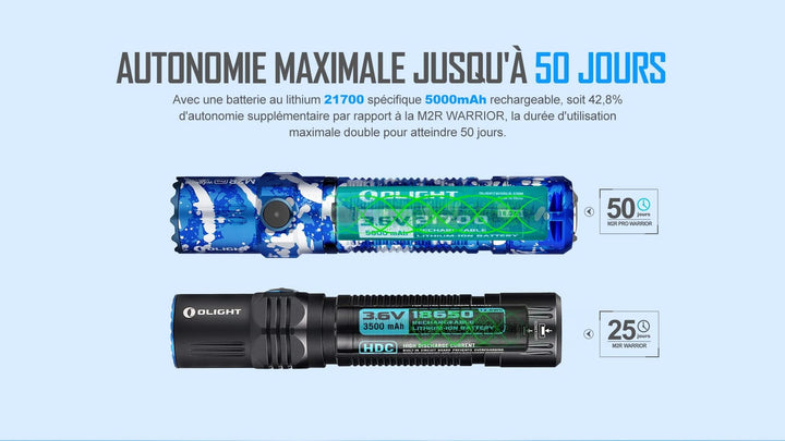 Mit einer einzigen Li-Ion-spezifischen Akku-Akku 21700 5000 mAh hat die M2R Pro Taschenlampe eine Batteriekapazität von 42% höher als die bisherige M2R Warrior-Version.