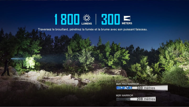 Dank dieser neuen Batterie und der Verwendung einer Cree XHP35 HI NW LED erreicht die maximale Leistung des Olight M2R Pro Warrior 1800 Lumen, d.h. 20% Steigerung, während seine maximale Reichweite 300 Meter, d.h. eine Verbesserung von 40% Bereich des Strahls! Der glattere Reflektor des M2R-Kriegers M2 wird durch eine weichere optische Linse ersetzt, die es ermöglicht, mehr zu diffundieren
