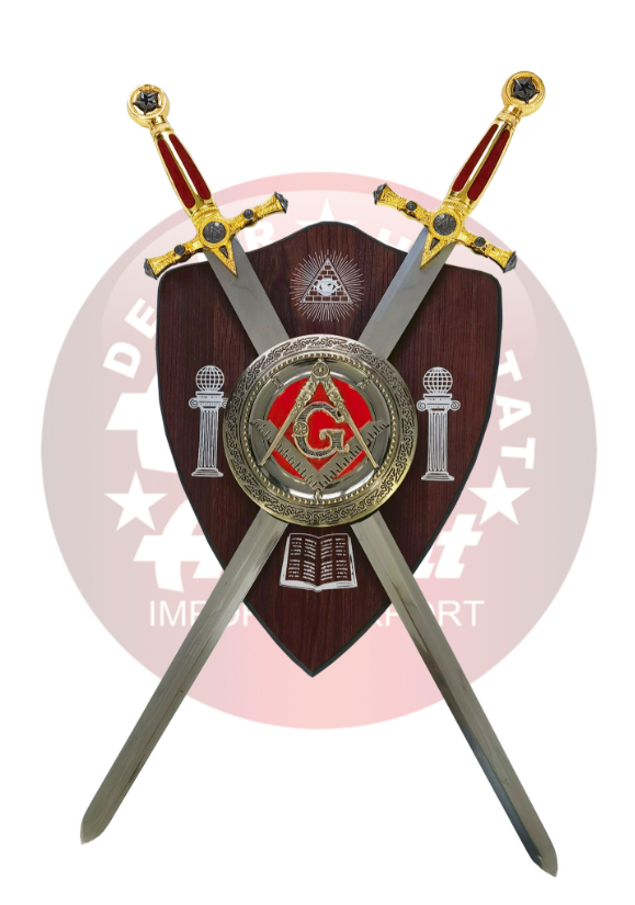 • Deux épées maçonniques avec manche en or et lame en velours rouge de 76 cm finition brillante.