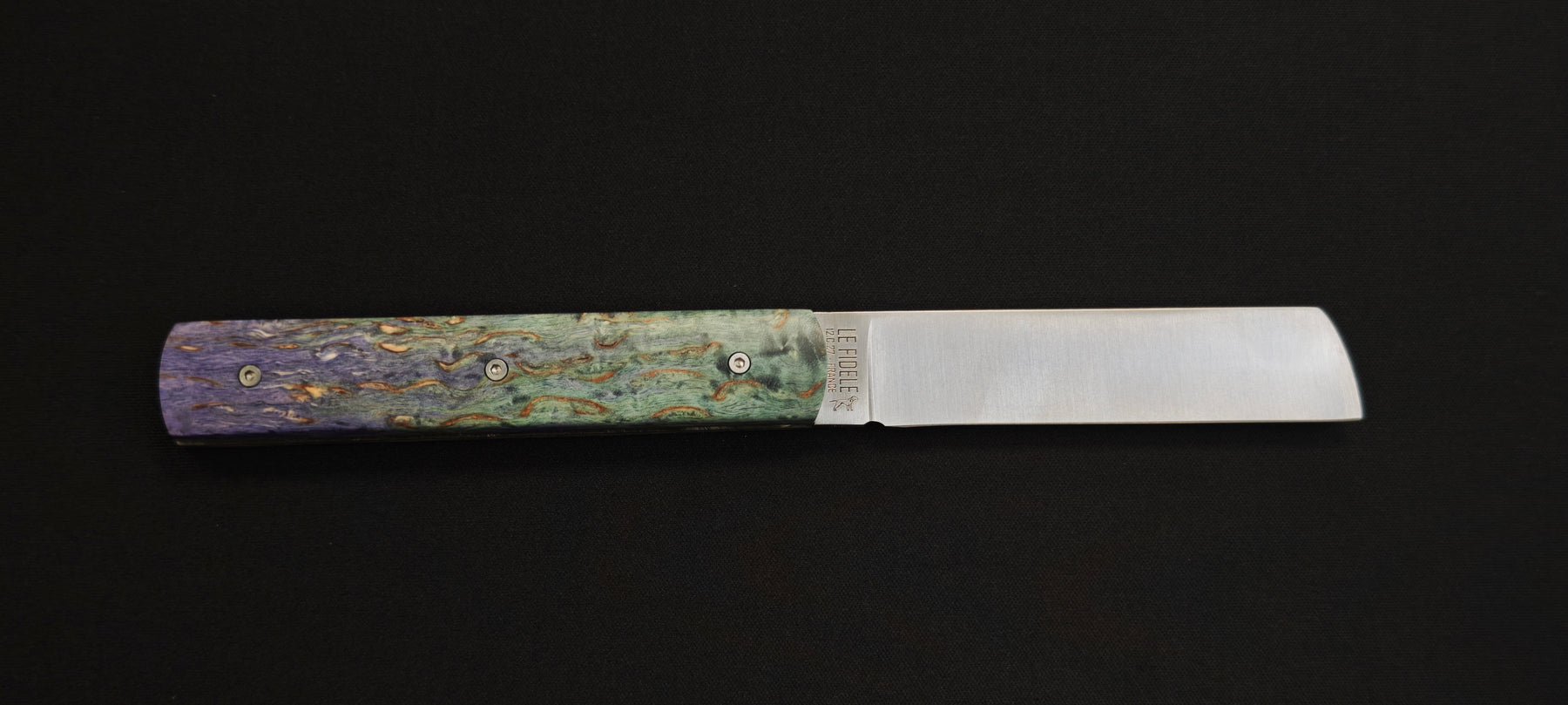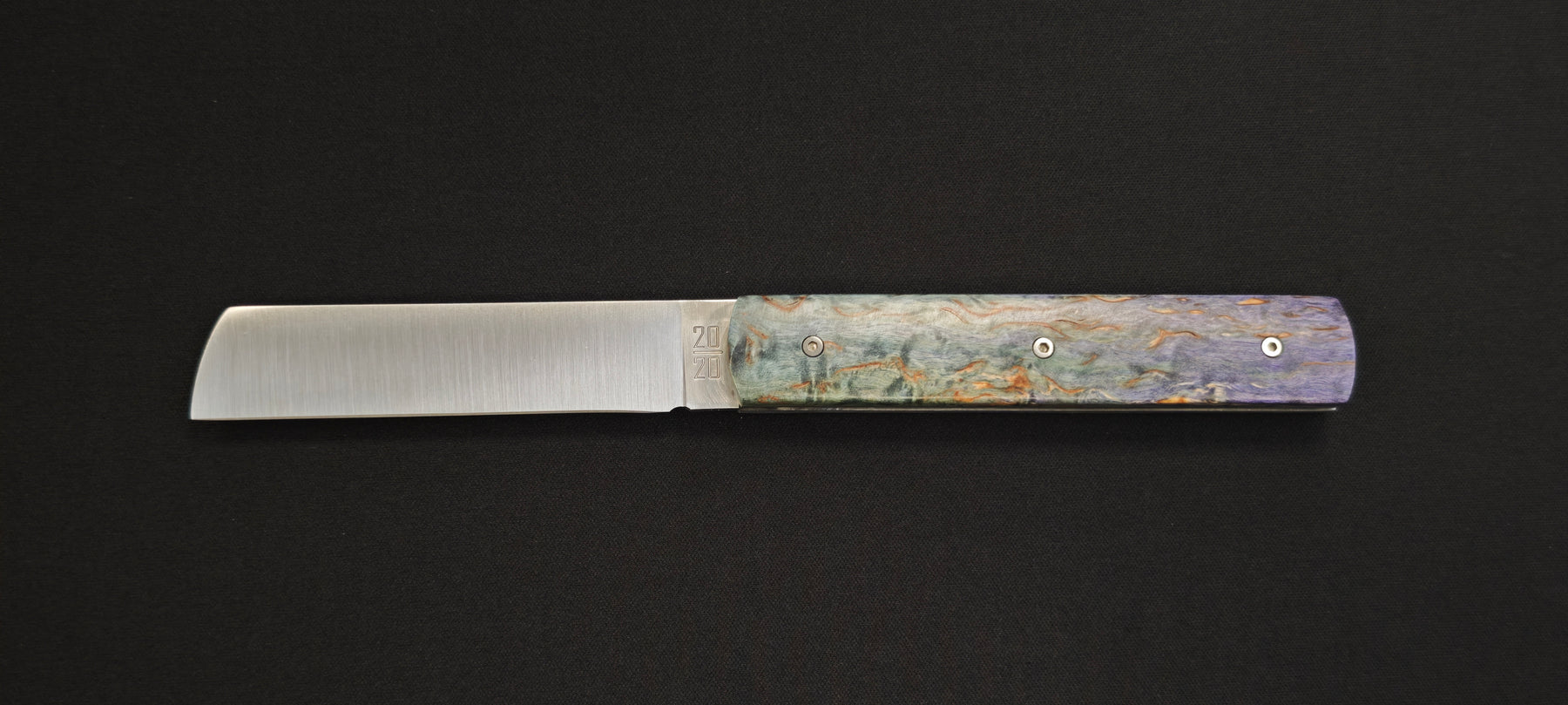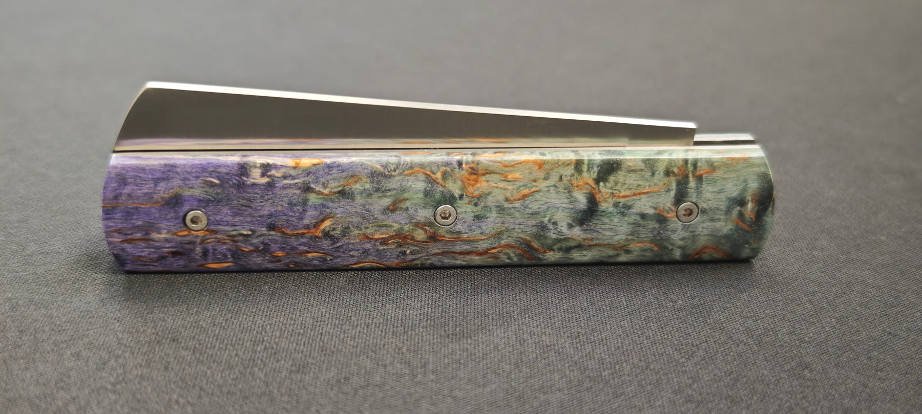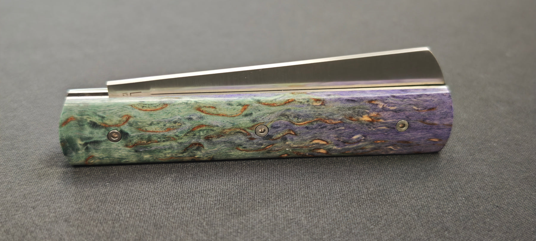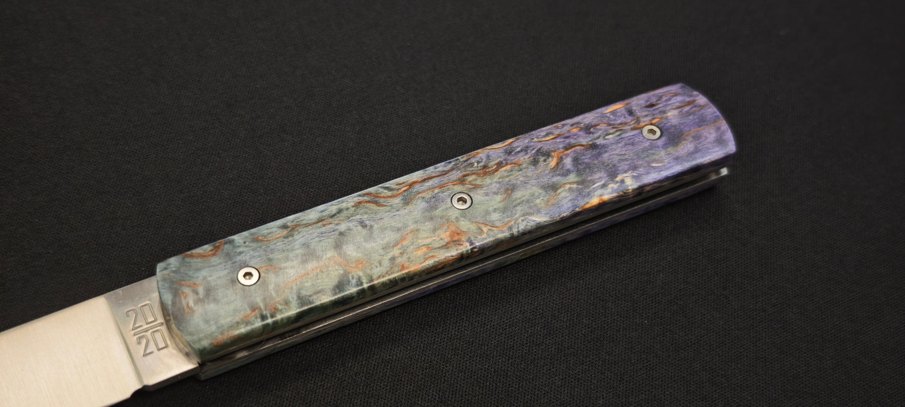 Jouant avec des manches autant rustiques et naturels que des manches sophistiqués et teintés. Du mammouth à l'olivier en passant par l'abalone, l'or et le pistachier, ce couteau possède un magnifique panachage de possibilité. L'air de la modernité artisanale du coutelier est naît.